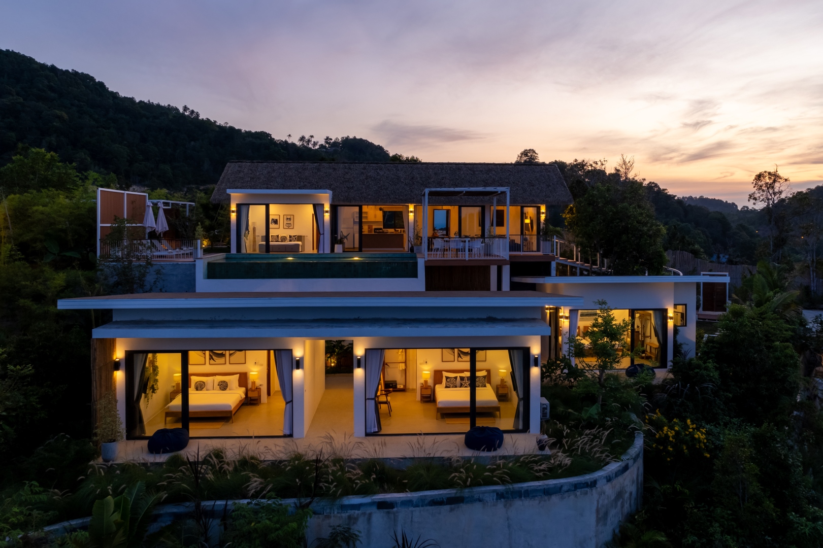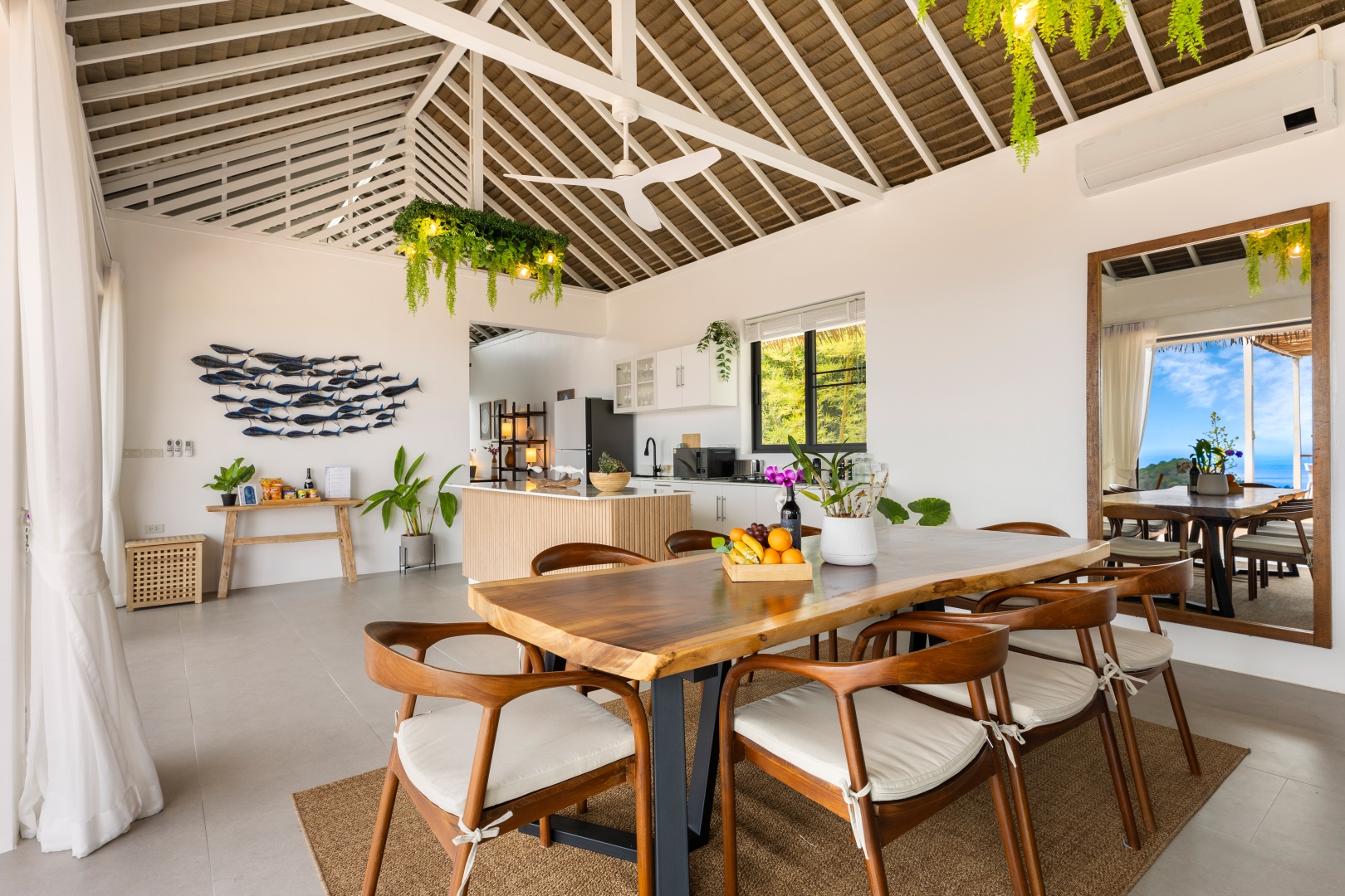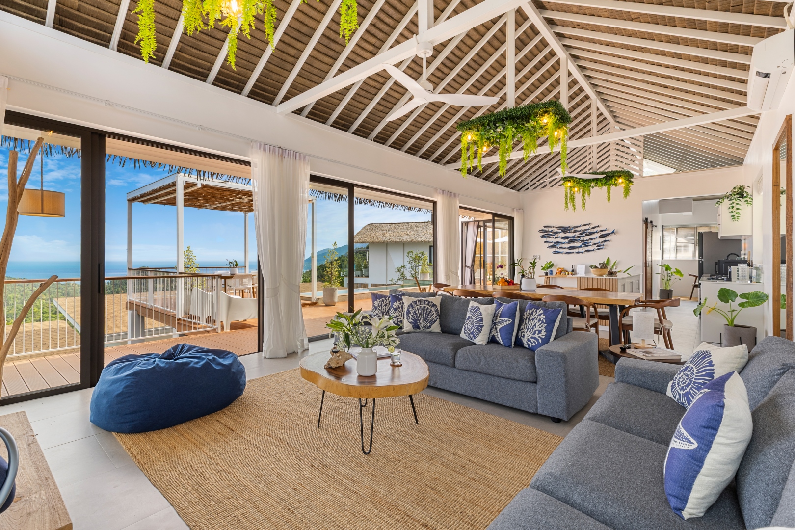 Our Indigo Villa is a luxurious two-level 3-bedroom retreat designed for families or groups. The upper level features a living area, fully equipped kitchen, and an extra room with a sofa bed that can be converted into an additional bed, along with a large living space. Step outside to enjoy the private pool and lounging area. On the lower level, three bedrooms with en-suite bathrooms offer stunning sea views, creating a perfect blend of comfort, space, and island charm on Koh Phangan.