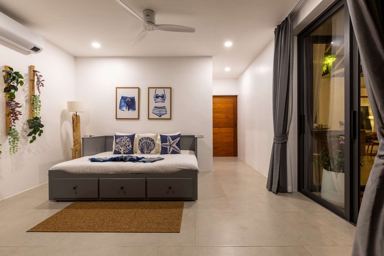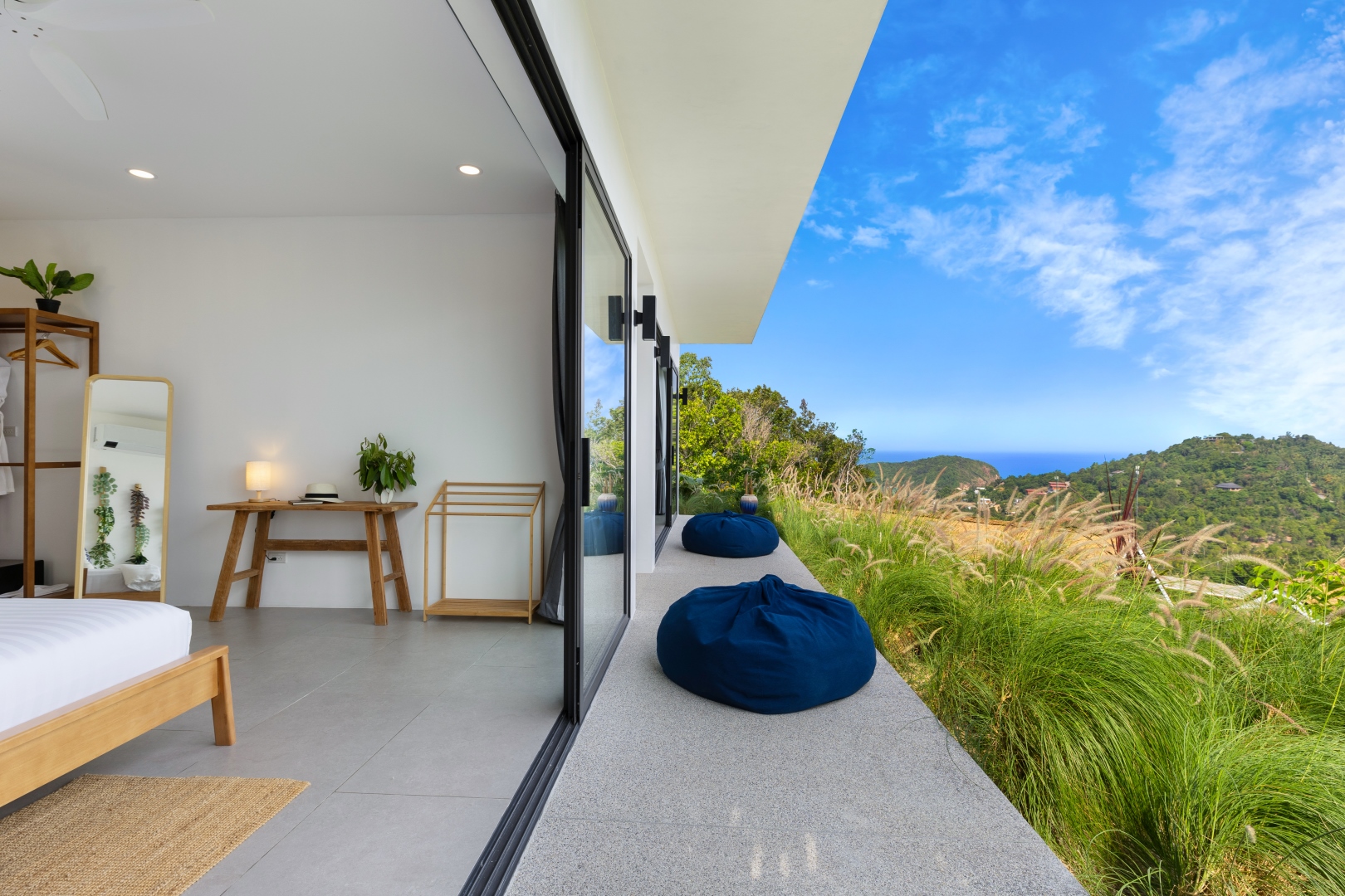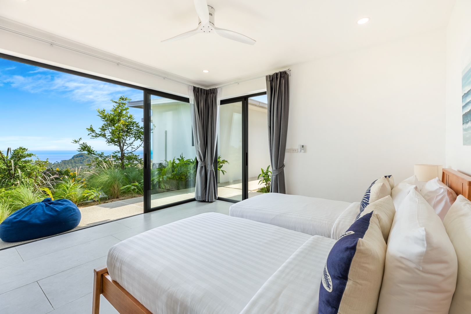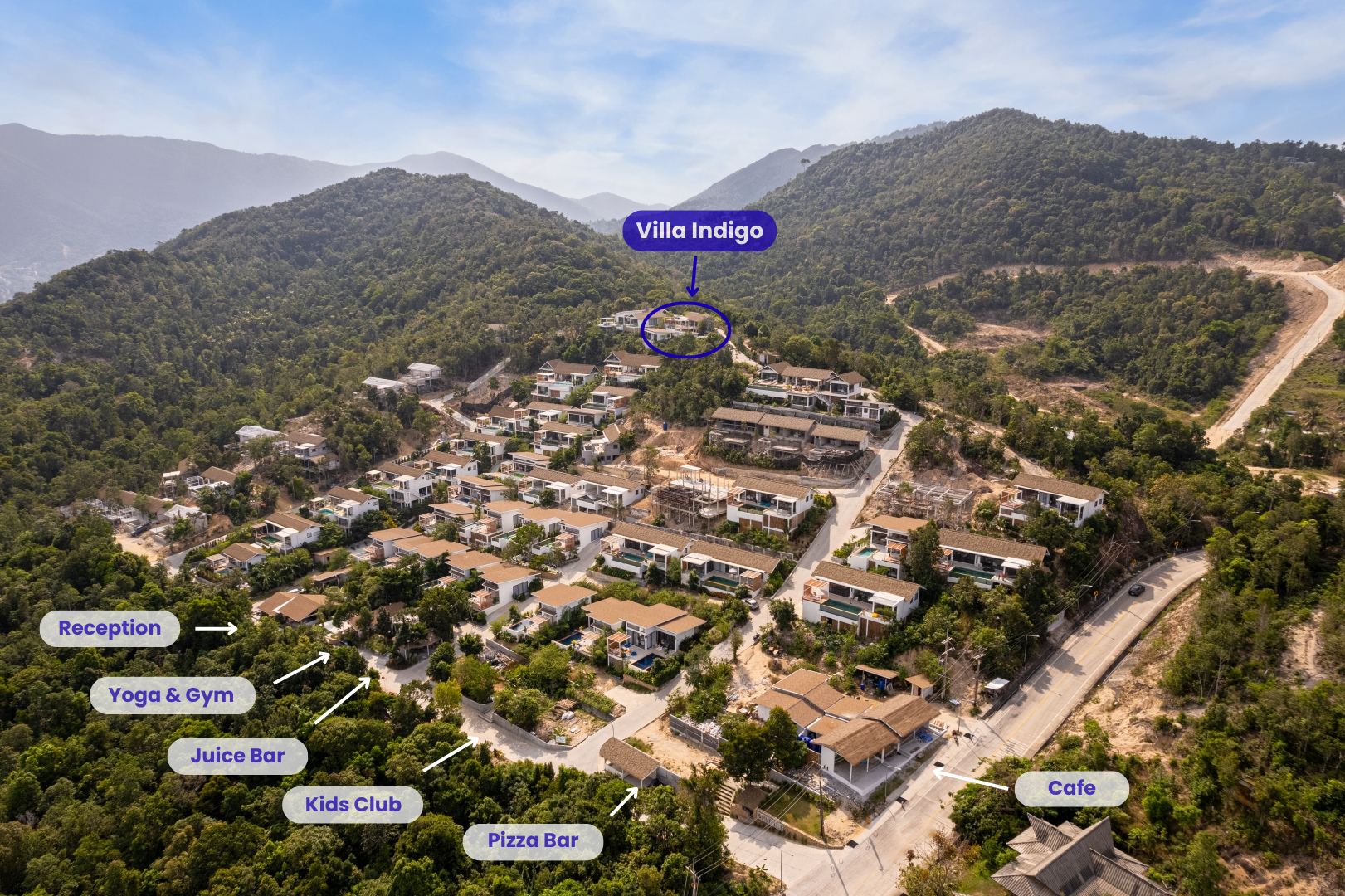 Our Indigo Villa is a luxurious two-level 3-bedroom retreat designed for families or groups. The upper level features a living area, fully equipped kitchen, and an extra room with a sofa bed that can be converted into an additional bed, along with a large living space. Step outside to enjoy the private pool and lounging area. On the lower level, three bedrooms with en-suite bathrooms offer stunning sea views, creating a perfect blend of comfort, space, and island charm on Koh Phangan.