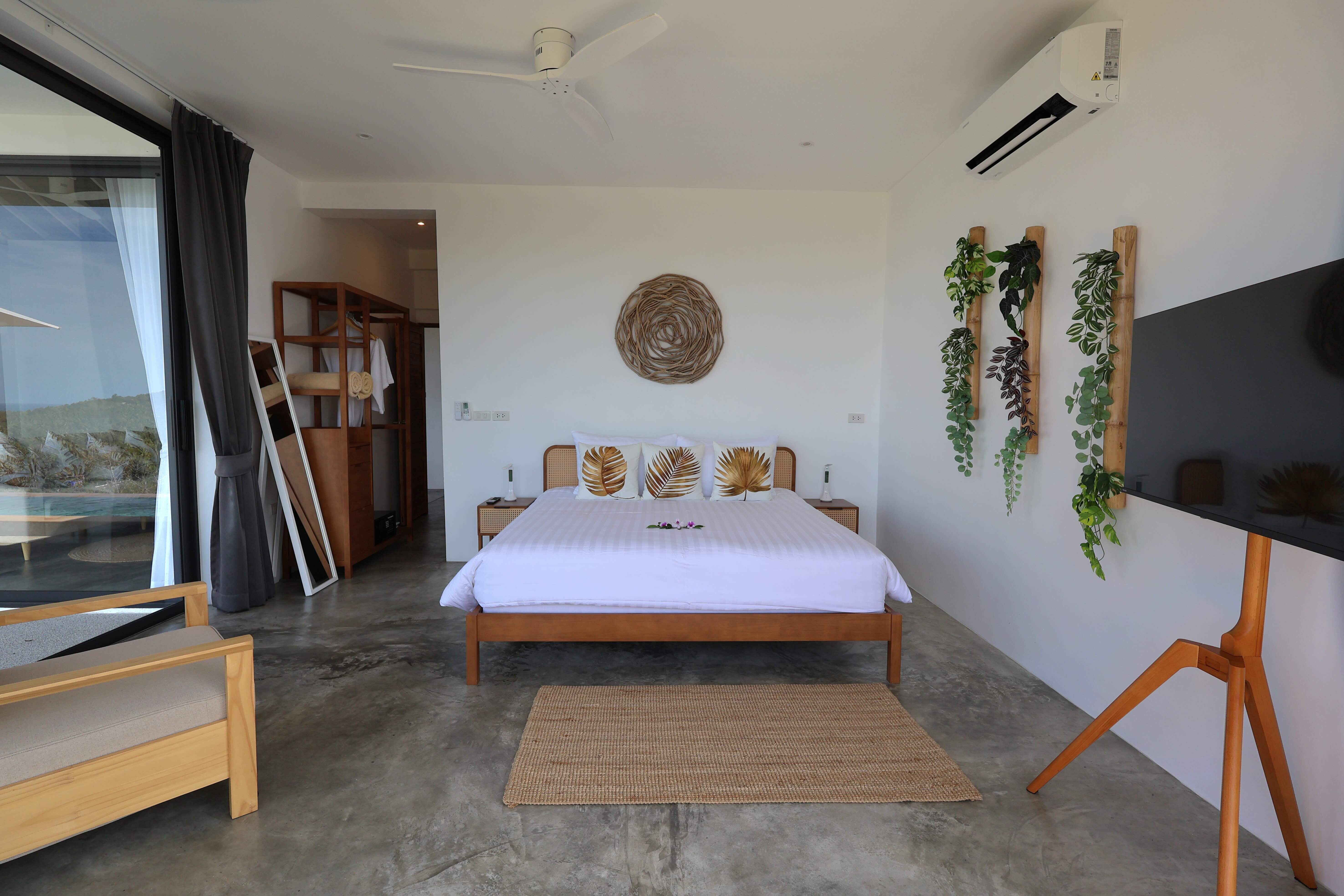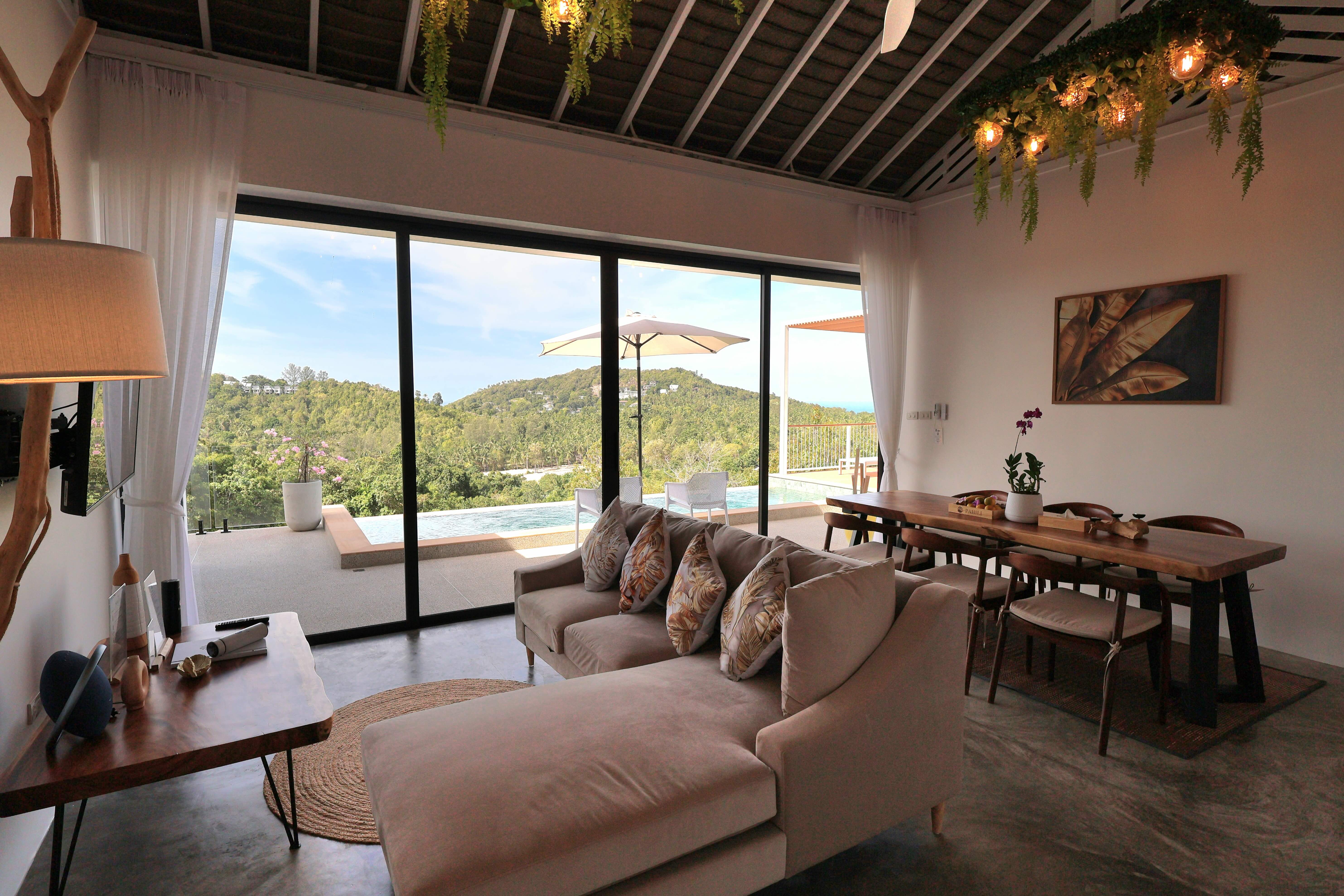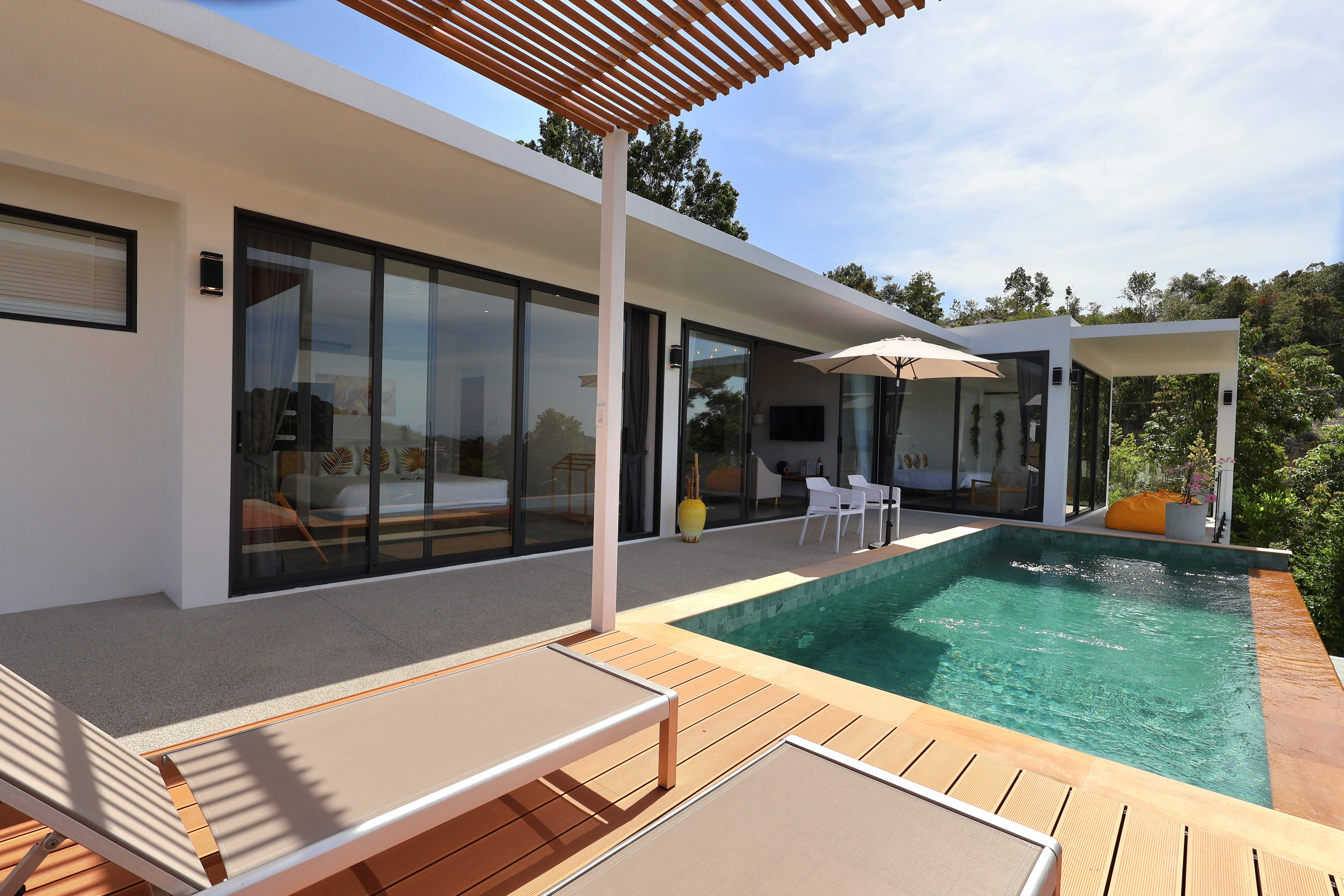 Our Golden Serenity Villa is a 2-bedroom tropical escape featuring two bathrooms, a bright living area, and a fully equipped kitchen. Designed for families or friends, it blends comfort with a relaxed island vibe. Outside, unwind by your private pool, terrace, and lounging area, enjoying the tranquil and inviting atmosphere of Koh Phangan.